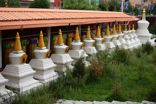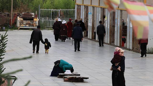 白塔公園里有119個小塔環(huán)繞,每座小塔分別代表全縣119個村子,小塔旁邊有許多長木板,供人們磕長頭用。