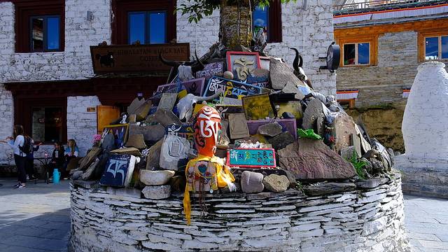 塔的周圍有一圈小轉經(jīng)筒,經(jīng)筒的中央還有一個巨大的轉經(jīng)筒,需要大家合力才能轉動。