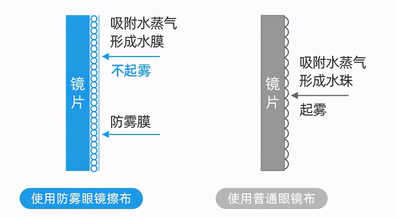 我們用眼鏡布擦拭眼鏡的時(shí)候,除霧劑會(huì)在鏡片表面形成一層完全透明的保護(hù)膜,讓水霧無法附著在鏡片上。