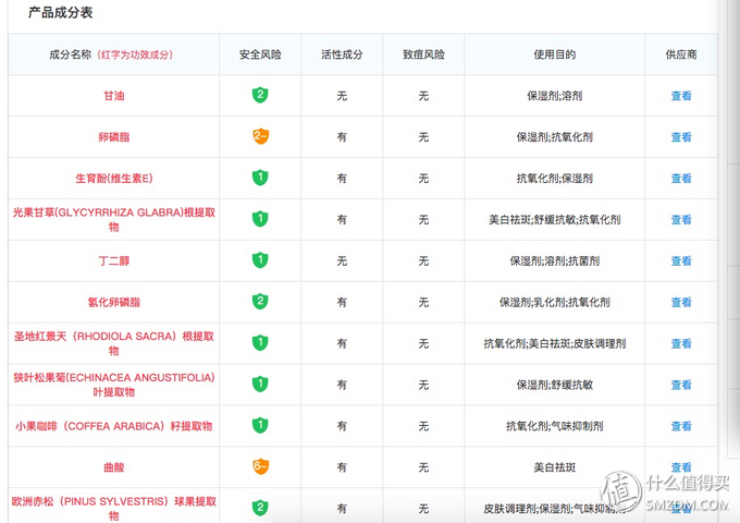 ▲可以看到主要成分。紅色的為功效成分,包括風(fēng)險(xiǎn)、致癌風(fēng)險(xiǎn)、使用目的等都可以看得到。里面就可以看到有光果甘草提取物的內(nèi)容,還有曲酸。可見(jiàn)黛珂還是挺貨真價(jià)實(shí)。但是悄聲嘀咕一句,如果光果甘草真的比曲酸值錢,為什么黛珂只宣傳自己添加曲酸,而不宣傳自己居然添加了這么黃金的光甘草定呢?而且搜遍全網(wǎng)都是力推一個(gè)什么雨的產(chǎn)品,說(shuō)是添加了光甘草定,呵呵,大家自己想想吧。