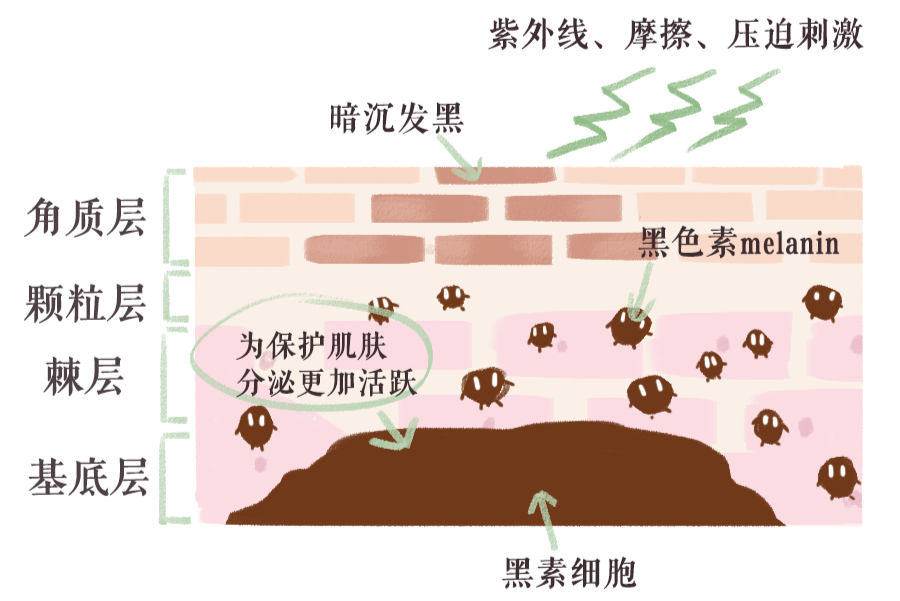 但不是只有對抗紫外線我們皮膚才會分泌黑色素,摩擦、壓迫刺激都會使黑色素細(xì)胞分泌更活躍。