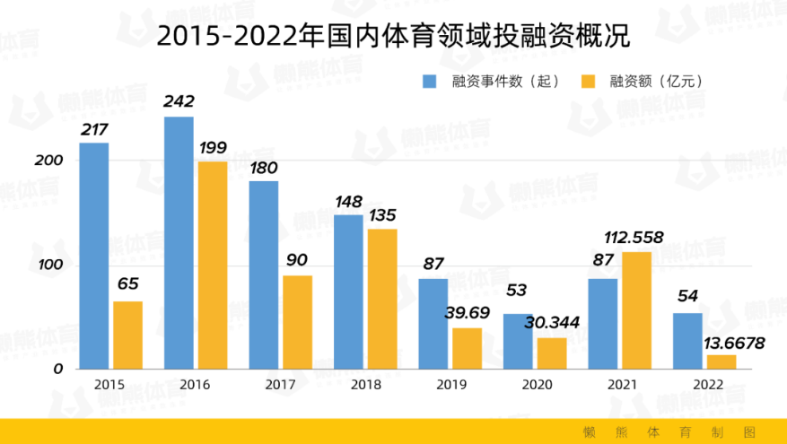 據(jù)懶熊體育結(jié)合公開資料和自身信源統(tǒng)計(jì), 2022國(guó)內(nèi)體育相關(guān)公司的投融資事件共有54起,其中透露了投融資金額的共47起,總額約合13.6678億人民幣。前一年同期,中國(guó)體育創(chuàng)業(yè)公司融資事件共有87起,總額為112.558億人民幣,2022年的投融資事件數(shù)和總額與2021年相比分別減少37.93%和87.86%。