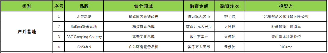 露營(yíng)產(chǎn)業(yè)鏈上,露營(yíng)營(yíng)地是目前比較受資本青睞的一環(huán)。2021開始,大熱荒野、ABC Camping、嗨king 野奢營(yíng)地等玩家均拿到融資。在消費(fèi)投資大環(huán)境整體遇冷的情況下,經(jīng)統(tǒng)計(jì),去年有4個(gè)戶外營(yíng)地獲得融資。