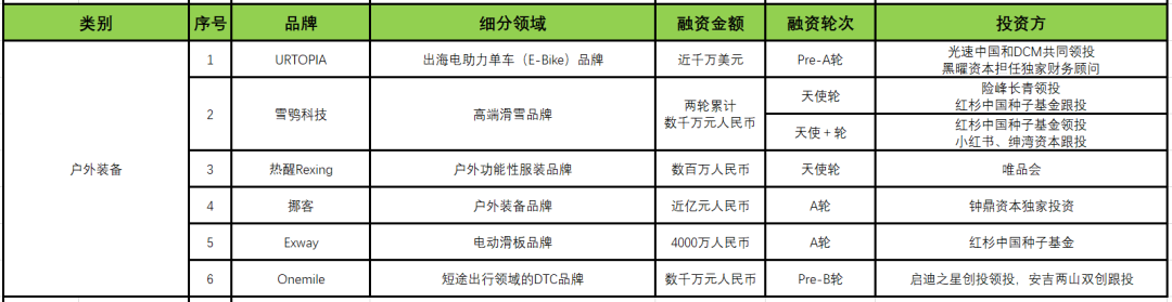 戶外融資賽道主要涉及滑雪、滑板、騎行和露營(yíng)等領(lǐng)域。其中,與露營(yíng)場(chǎng)景結(jié)合的是挪客Naturehike和熱醒Rexing兩個(gè)品牌。