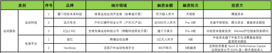 為了深入探究,我們重新梳理了與線下實(shí)體商業(yè)相關(guān)的融資事件共29起,涉及:運(yùn)動(dòng)服務(wù)(包括運(yùn)動(dòng)科技、電商平臺(tái)共5起)、戶外營(yíng)地(4起)、戶外裝備(6起)、運(yùn)動(dòng)鞋服(8起)、體育教培(6起)五大板塊。