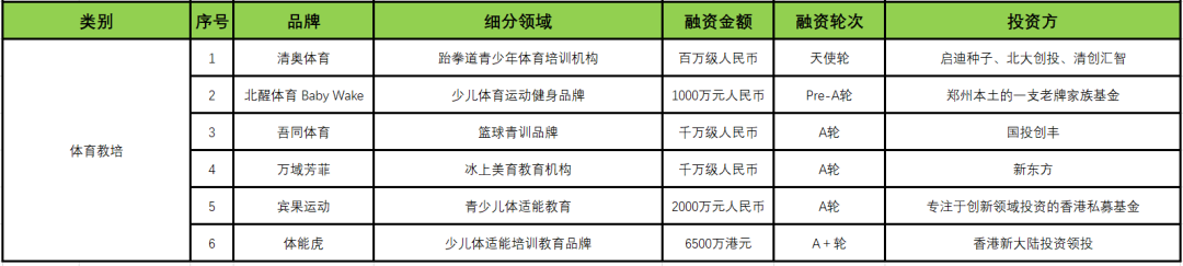 除了與戶外相關(guān)的賽道,體育教育/培訓(xùn)賽道也有所回暖。據(jù)不完全統(tǒng)計(jì),去年有6個(gè)相關(guān)品牌獲得融資,主要集中于兒童領(lǐng)域“體適能”賽道。