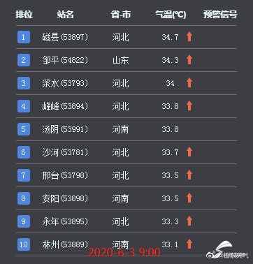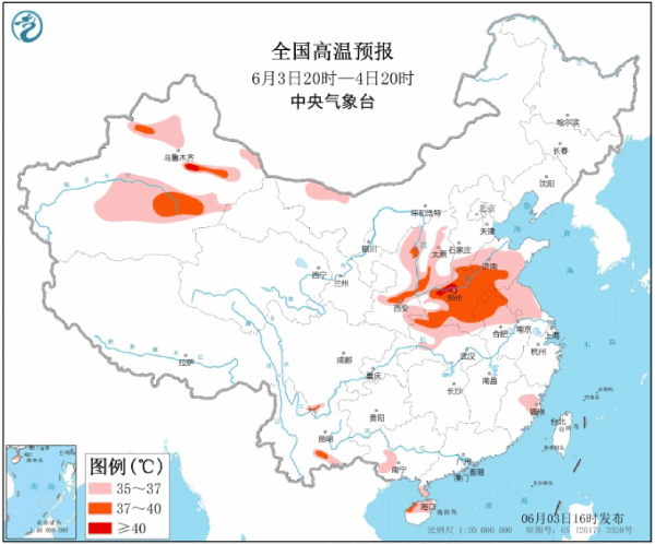 山東省氣象臺(tái)于6月3日17時(shí)00分繼續(xù)發(fā)布高溫橙色預(yù)警信號(hào):今天,魯西北、魯中和魯南地區(qū)已出現(xiàn)35℃以上的高溫天氣。