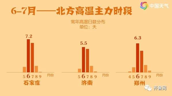 不過(guò),北方的炎熱大多局限于白天,西北地區(qū)東部、華北等地早晚時(shí)段都還比較涼爽。從氣候上來(lái)看,每年6、7月份是北方一年中高溫集中的時(shí)段,濟(jì)南、石家莊、鄭州都是6月高溫日數(shù)多,而北京、西安、天津則是7月高溫日數(shù)更勝一籌。