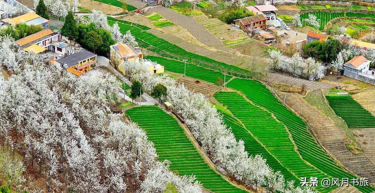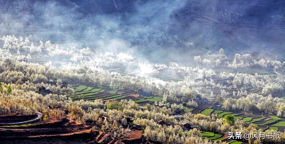 2、神仙包:拍攝萬畝梨花晨景,登高俯瞰高原雪梨花盛開的壯麗晨景。