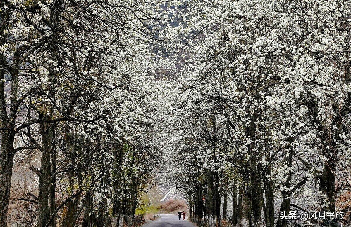 道路兩旁,樹身高大的梨樹,花朵開得茂盛,花瓣如絲絨般柔和,自然搭成一個(gè)天然屏障,過往的車輛和樹下的行人,穿行其間,粉妝玉砌,如入仙境!