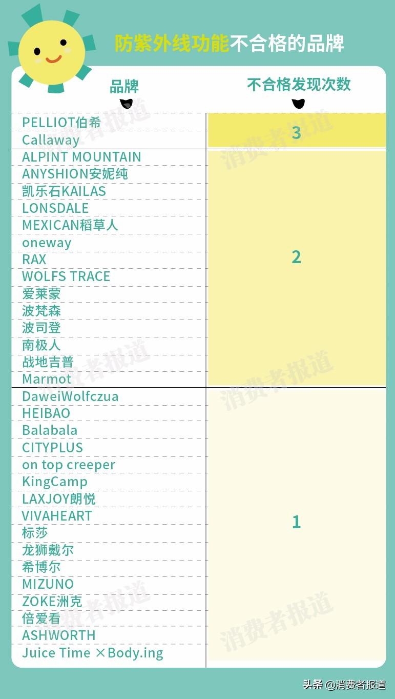 綜合數(shù)據(jù)顯示,抽檢的防曬服及標注具有防紫外線或防曬功能的服裝中,共有152批次不合格,不合格率達56.1%。