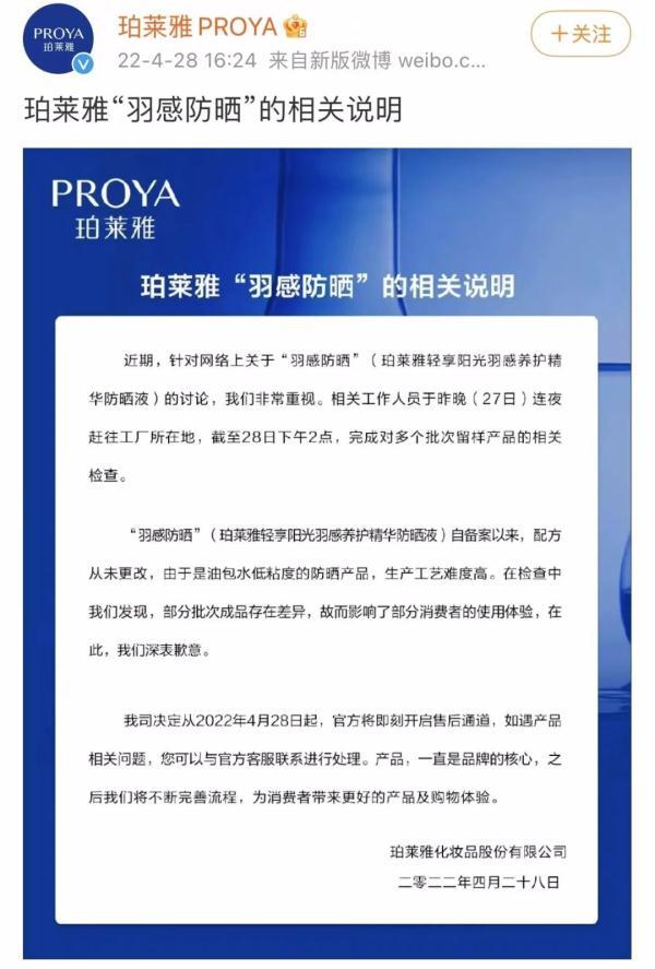 隨著輿情的發(fā)酵,珀萊雅官方發(fā)表了致歉聲明,稱“羽感防曬(珀萊雅輕享陽光羽感養(yǎng)護(hù)精華防曬液)自備案以來,配方從未更改,由于是油包水低黏度的防曬產(chǎn)品,生產(chǎn)工藝難度高,在檢查中我們發(fā)現(xiàn)部分批次成品存在差異,影響了部分消費(fèi)者的使用體驗(yàn),在此我們深表歉意。”