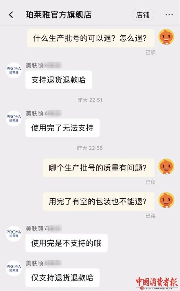 《中國消費(fèi)者報(bào)》記者詢問天貓珀萊雅旗艦店客服時(shí)卻發(fā)現(xiàn)并不是這樣。該客服稱:“僅支持退貨退款,使用完了無法支持,用完了有包裝瓶也不行?!币簿褪钦f,即便消費(fèi)者有訂單成交記錄,但只要用過、用完沒保存包裝瓶,就不能退款。至于珀萊雅聲明中提到存在差異的“部分批次”到底是哪些,客服人員也避而不答。
