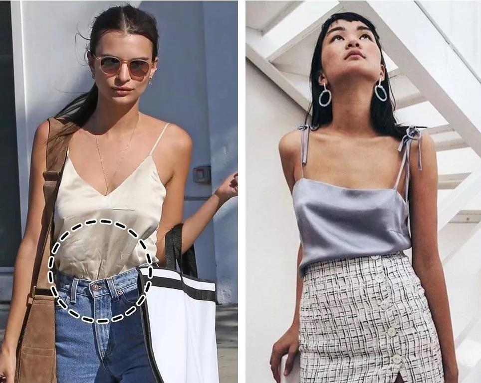 褶皺夏天衣服都很薄,特別容易出褶子,就算擁有袁泉般的高冷容貌,一身的褶子看著也有些窮苦。左邊這種太薄太透的面料就別買了,換成密實(shí)有垂墜感的就好很多。