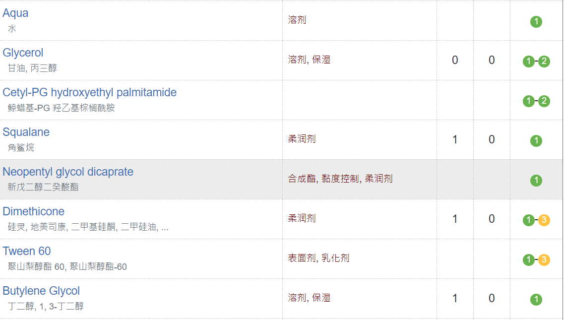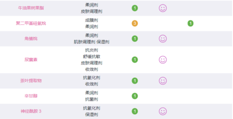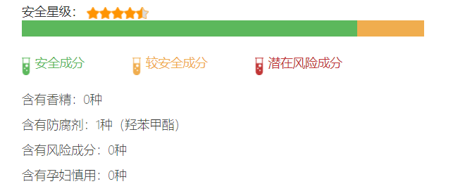 除了一種羥苯丙酯防腐劑存在風(fēng)險(xiǎn),其主要成分都是的,評(píng)級(jí)很高。其中植物提取成分甘草酸二甲、川谷籽提取物等成分舒緩抗敏、美白果不錯(cuò)。