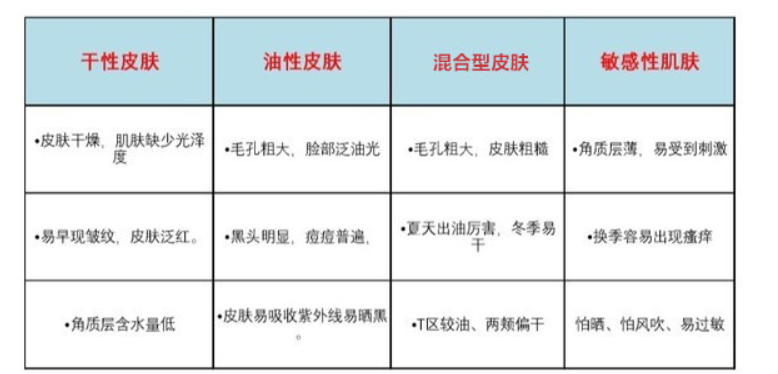 常規(guī)膚質(zhì)分為五大類:即:中性、干性、油性、混合型、敏感型。