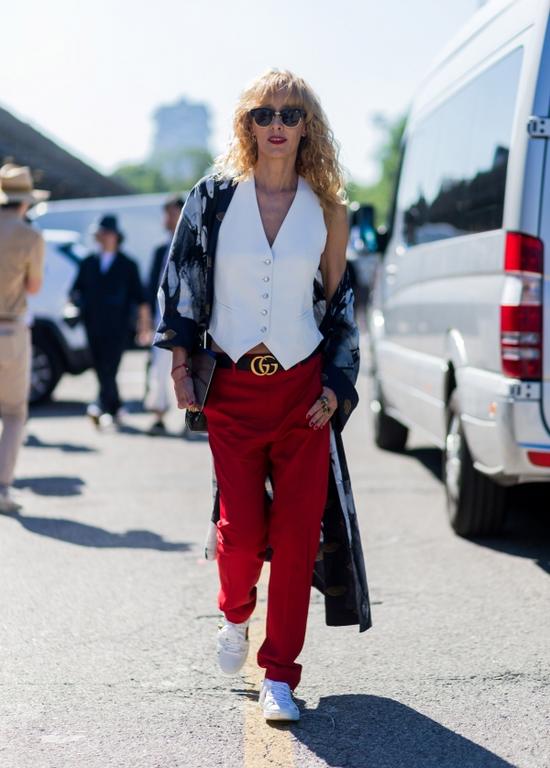 時髦博主Alexandra Lapp時髦街拍。她戴Les Specs豹紋邊框粉色反光墨鏡,身穿Natasha Zinko粉色銀色緞面闊袖外套,內(nèi)搭白色雪紡吊帶衫,下身穿Rag & Bone緊身牛仔褲,腳踩Gucci灰色穆勒鞋,肩背Fendi黑色鏈條包。