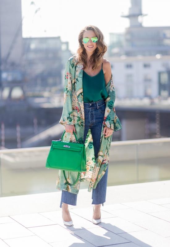 時髦博主Alexandra Lapp時髦街拍。她戴Ray Ban綠色鏡面反光墨鏡,身穿Zara綠色印花雪紡睡袍,內(nèi)搭綠色絲綢吊帶衫,下身穿Vetements不規(guī)則褲腿邊牛仔褲,腳踩Christian Louboutin白色尖頭鞋,手拿Hermes綠色Kelly包。
