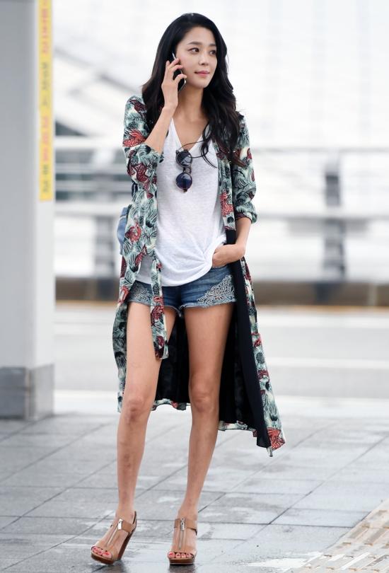 韓高恩身穿印花長款開衫,內(nèi)搭白色T恤,下穿牛仔短褲,腳穿裸色T字帶魚嘴粗跟涼鞋