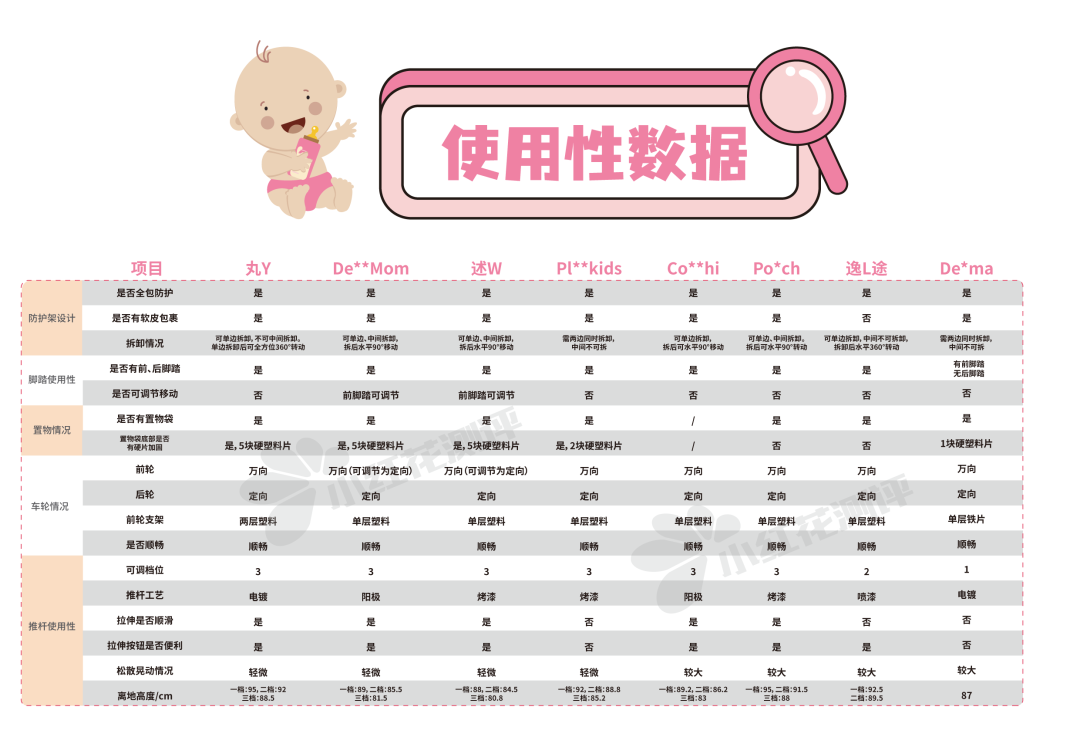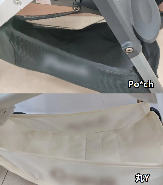 而且丸Y的底部車架粗壯,顯得更穩(wěn)固;Pl**kids、Po*ch的中等,而De**Mom、述W、De**ma、Co**hi的車架則較細。