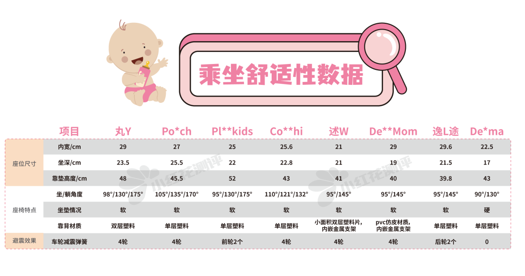 丸Y、De**Mom、述W、Co**hi、Po*ch都有4輪減震,能夠做到減震與穩(wěn)定并行;Pl**kids、逸L途分別只有前輪或后輪有減震彈簧設計。