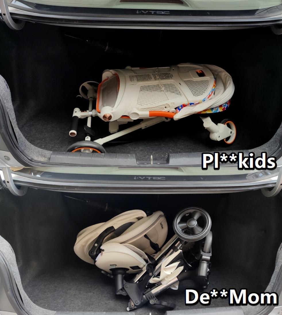 Pl**kids雖然重,但是它收車方便,收納后呈 “壓扁”狀,單手收車后還可拎著推桿拖行。