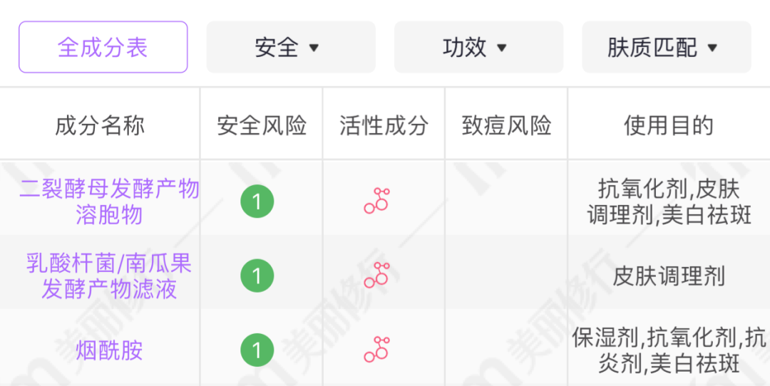 核心成分是60%的二裂酵母發(fā)酵產(chǎn)物+31%南瓜果發(fā)酵產(chǎn)物以及2%煙酰胺,適合想要初步抗衰老以及想要美白的人,不過,發(fā)酵成分雖好卻也有一定的去角質性,如果是敏感的姐妹可能會有一點不耐受。