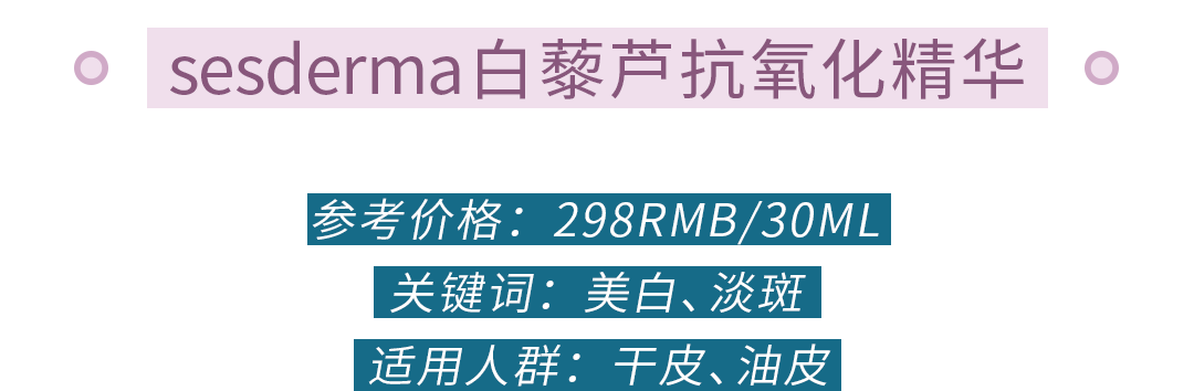 它的功效是抗氧化、提亮祛黃氣。主要成分是白藜蘆,聽說它被稱為“抗氧化魔術師”,可以有效抵御暗沉去黃。之前因為總是熬夜寫稿,臉色暗沉了不少,一聽它的功效我一下子就被種草了