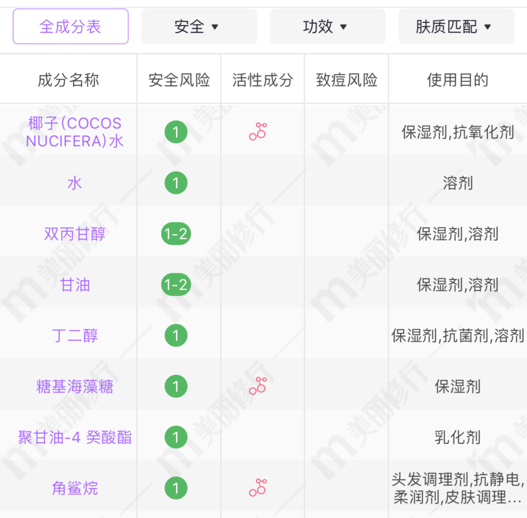 51%椰子水可以起到抗氧化作用,25%透明質酸和角鯊烷等,都能有起到保濕滋潤皮膚的效果,用完臉上潤潤的。