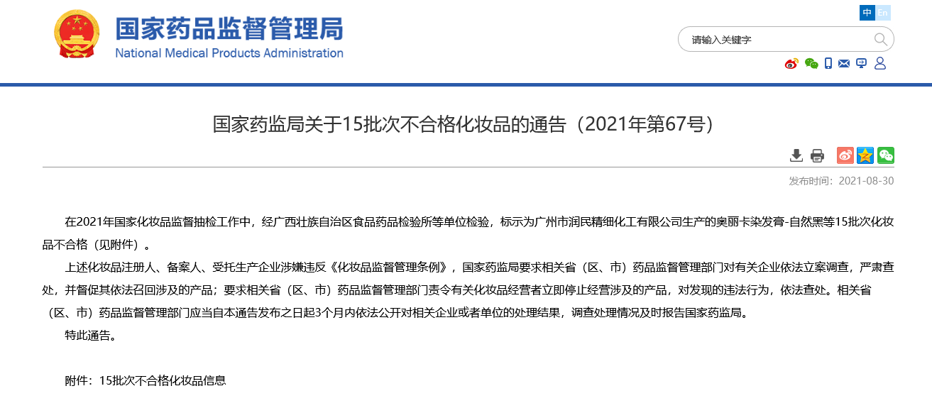 近日,藥品監(jiān)督管理局發(fā)布《關于15批次不合格化妝品的通告》(2021年第67號)。通告顯示,在2021年化妝品監(jiān)督抽檢工作中,共發(fā)現(xiàn)15批次化妝品不合格。此次不合格項目涉標簽標識不合規(guī)、苯基甲基吡唑啉酮超標、菌落總數(shù)過高等,涉及香蒲麗、唯婷、蓓娜爾斯等品牌。