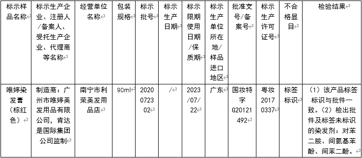 此次抽檢中,一批次唯婷染發(fā)膏被檢出不合格。其標示由廣州市唯婷美發(fā)用品有限公司制造、肯達是國際集團公司監(jiān)制、標稱為唯婷染發(fā)膏(棕紅色)(規(guī)格為90ml)、批準文號/備案號為國妝特字G20121492、標示生產(chǎn)許可證號為粵妝20170337的染發(fā)膏,標簽標識被檢出不合格。檢驗結果顯示,該產(chǎn)品標簽標識與批件一致;同時檢出批件及標簽未標識的染發(fā)劑:對苯二胺、間氨基苯酚、間苯二酚。