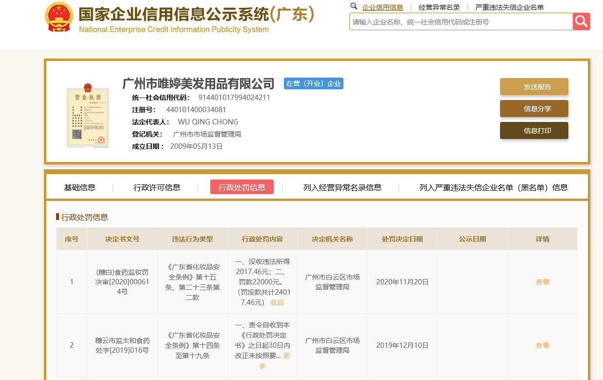南都記者調查發(fā)現(xiàn),這并非是唯婷染發(fā)膏被檢出未標識的染發(fā)劑。企業(yè)信用信息公示系統(tǒng)(廣東)顯示,2020年11月,廣州市唯婷美發(fā)用品有限公司曾被行政處罰,其生產(chǎn)的不同批次的“唯婷染發(fā)膏—棕紅色”化妝品被檢出批件及標簽未標識的染發(fā)劑:對氨基苯酚、間氨基苯酚、間苯二酚、對苯二胺。廣州市白云區(qū)市場監(jiān)督管理局確認該公司未按照已經(jīng)注冊產(chǎn)品的配方和技術要求組織生產(chǎn)特殊用途化妝品,違反《廣東省化妝品條例》相關規(guī)定,對其依法進行行政處罰,沒收違法所得2017.46元;罰款22000元,罰沒款共計24017.46元。
