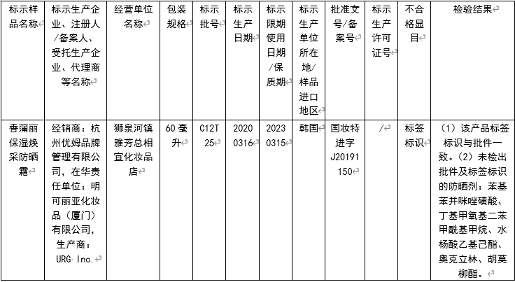 此次抽檢中,一批次由URG Inc.生產(chǎn)、杭州優(yōu)姆品牌管理有限公司(在華責任單位:明可麗亞化妝品(廈門)有限公司)經(jīng)銷、規(guī)格為60毫升、標稱為香蒲麗保濕煥采防曬霜、批準文號/備案號國妝特進字J20191150的防曬霜被檢出標簽標識不合格。檢驗結果顯示,產(chǎn)品標簽標識與批件一致,未檢出批件及標簽標識的防曬劑:苯基苯并咪唑磺酸、丁基甲氧基二苯甲?;淄椤⑺畻钏嵋一乎?、奧克立林、胡莫柳酯。