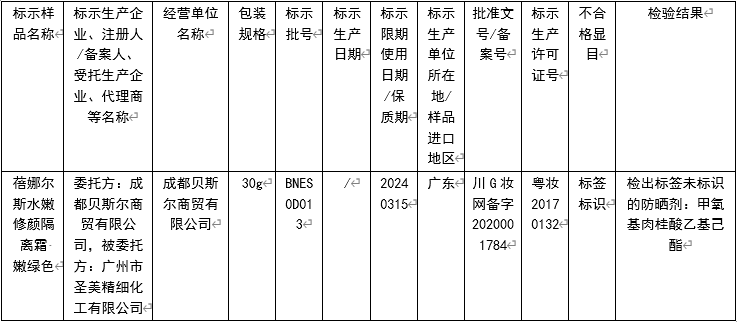 此外,一批次標示委托方為成都貝斯爾商貿有限公司,被委托方為廣州市圣美精細化工有限公司、標稱為蓓娜爾斯水嫩修顏隔離霜(嫩綠色)、批準文號/備案號為川G妝網(wǎng)備字2020001784、標示生產(chǎn)許可證號粵妝20170132的隔離霜,被檢出標簽標識不合格,結果顯示檢出標簽未標識的防曬劑:甲氧基肉桂酸乙基己酯。