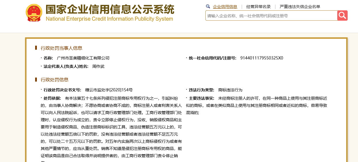 從企業(yè)信用信息公示系統(tǒng)查詢到,此前廣州市圣美精細化工有限公司曾被行政處罰。其作為蓓娜爾斯水嫩修顏隔離霜(嫩綠色)生產(chǎn)被委托方,2019年未經(jīng)商標注冊人許可擅自生產(chǎn)帶“瑾熙”商標的唇膏、潔面乳,違反了《中華人民共和國商標法》相關規(guī)定,構成侵犯注冊商標專用權違法行為。2020年6月廣州市白云區(qū)市場監(jiān)督管理局對其做出行政處罰,責令立即停止商標侵權行為,并沒收、銷毀侵犯“瑾熙”注冊商標專用權的唇膏、潔面乳各1支,罰款人民幣8200元。
