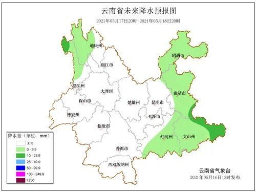 5月16日20時(shí)-5月17日20時(shí):昭通東南部、曲靖、文山、昆明東部、紅河?xùn)|南部陰天間多云有小雨局部中雨或大雨,迪慶北部、怒江北部多云有陣雨,其它地區(qū)晴間多云。