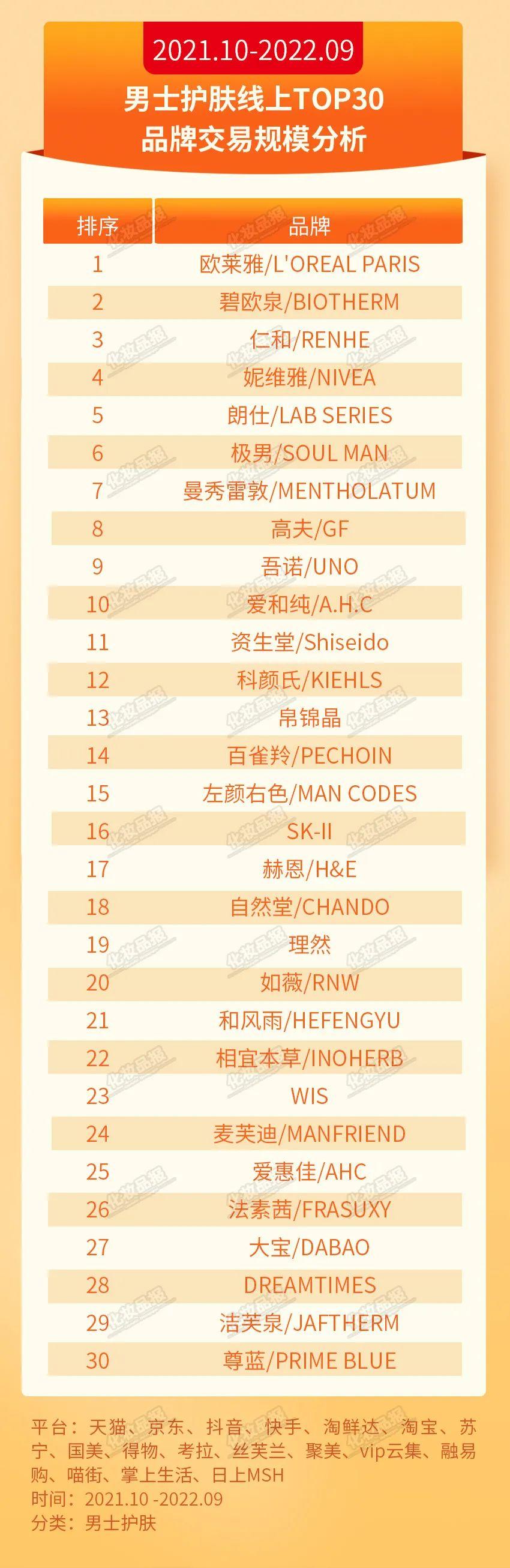 男士護(hù)膚:歐萊雅零售額超10億元,仁和進(jìn)入TOP3在男士護(hù)膚TOP30品牌中,歐萊雅作為零售額超10億元的品牌,穩(wěn)居榜首。此外,位列第二的碧歐泉同樣隸屬于歐萊雅集團(tuán)旗下。本土品牌仁和超越妮維雅,位列第三。