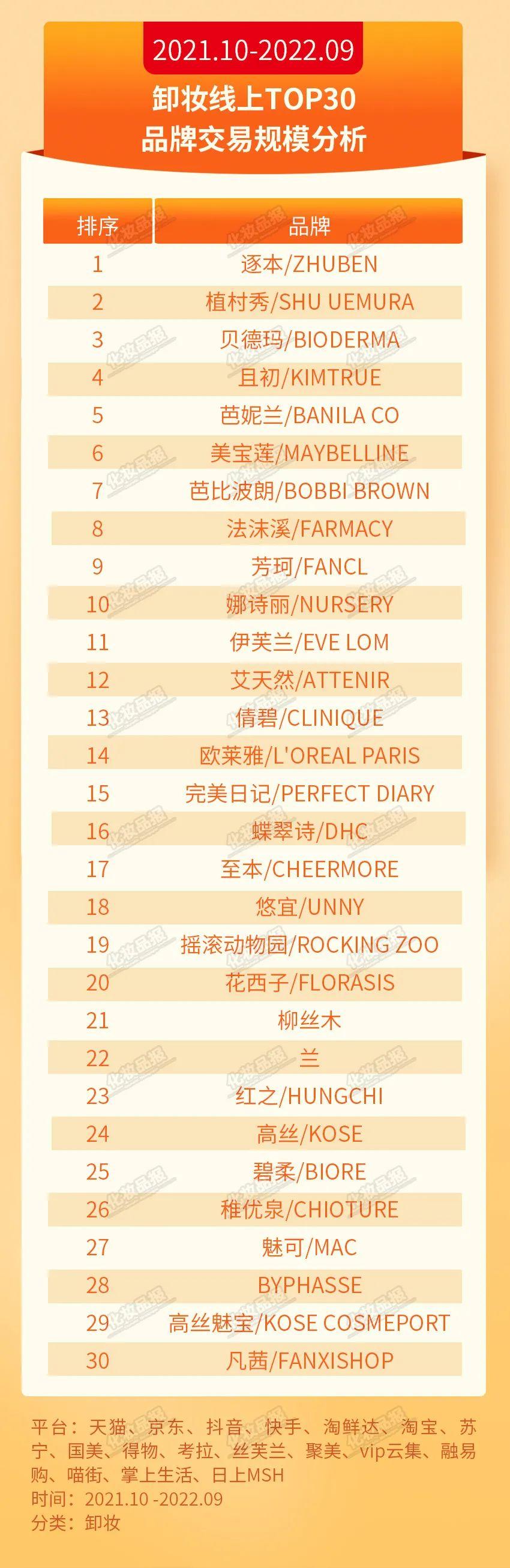 卸妝:逐本超植村秀、貝德瑪居榜首在卸妝TOP30品牌中,逐本強(qiáng)勢突圍,超越植村秀、貝德瑪,穩(wěn)居榜首。此外,本土品牌且初、日記、至本、搖滾動物園、花西子躋身TOP20。
