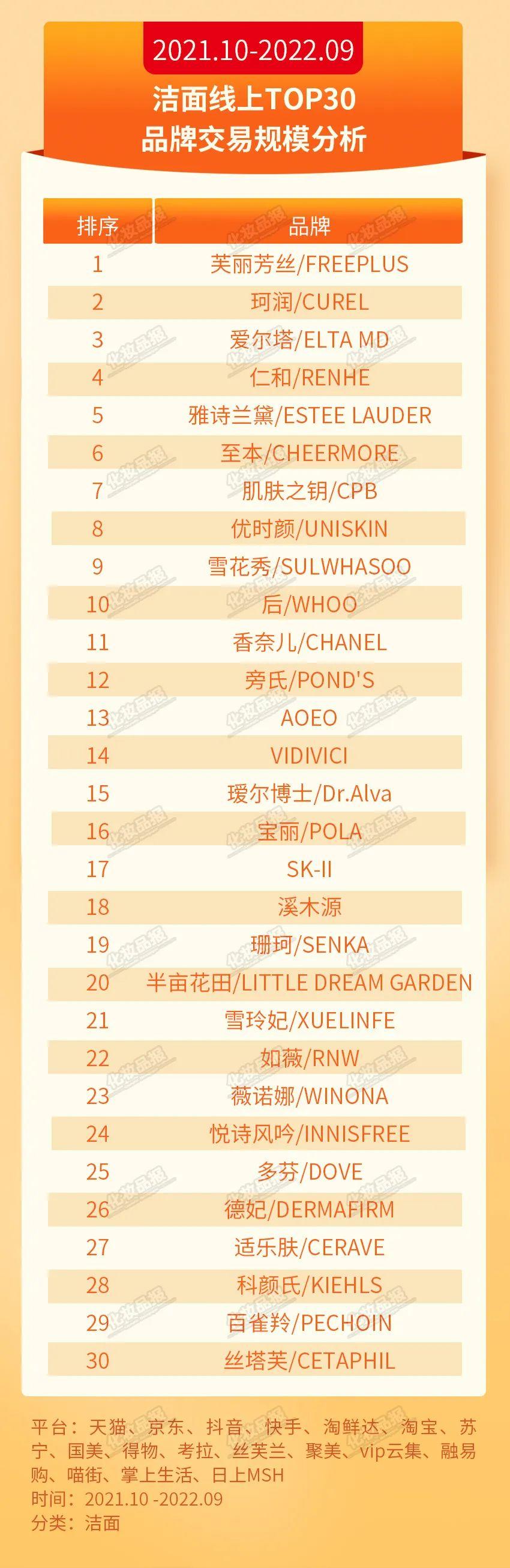 潔面:芙麗芳絲零售額超10億元 國貨迎頭趕上在潔面TOP30品牌中,芙麗芳絲作為零售額超10億的品牌,力壓珂潤、愛爾塔,穩(wěn)居榜首。本土品牌中,仁和、至本、優(yōu)時顏表現(xiàn)突出,進(jìn)入TOP10。