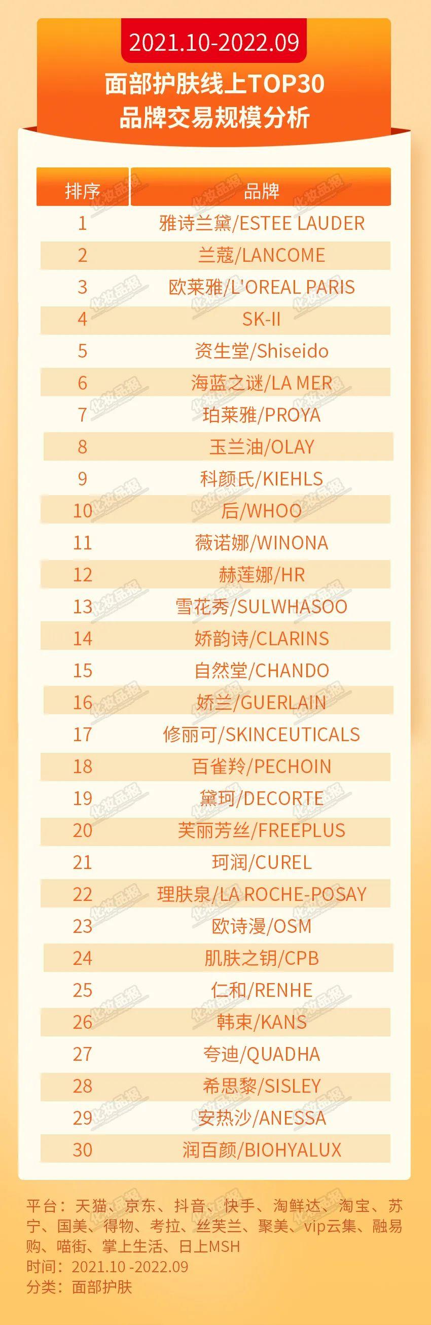 近日,歐特歐國際咨詢公司向《化妝品報》提供了2022年9月MAT(2021年10月-2022年9月)滾動年期間化妝品細(xì)分品類的線上銷售榜單,涵蓋面部護(hù)膚、潔面、面膜、防曬、口腔護(hù)理、卸妝、男士護(hù)膚、香水、沐浴露十大品類。