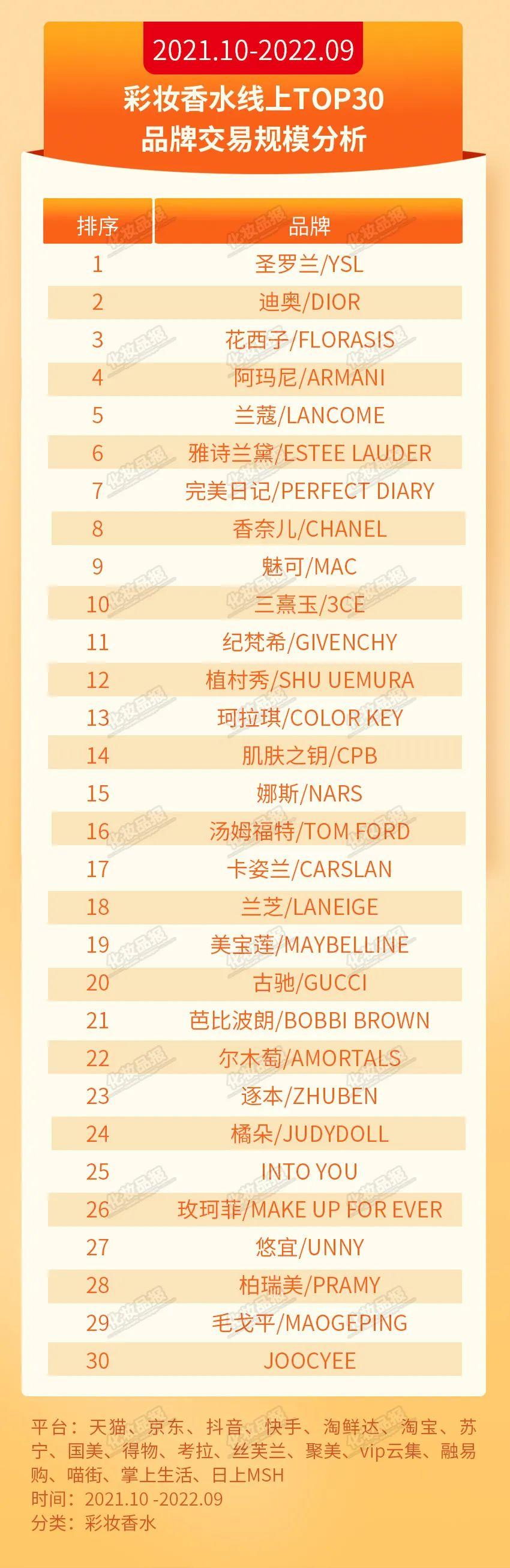 彩妝香水:圣羅蘭領(lǐng)跑,花西子進(jìn)入TOP3在彩妝香水TOP30品牌中,國貨占10席。前三品牌依次是圣羅蘭、迪奧、花西子。目前,花西子天貓官方旗艦店粉絲數(shù)超1000萬,今年618期間,其空氣蜜粉包攬?zhí)熵埫鄯刍刭彴?、熱銷榜、好評榜三大榜單第一名。