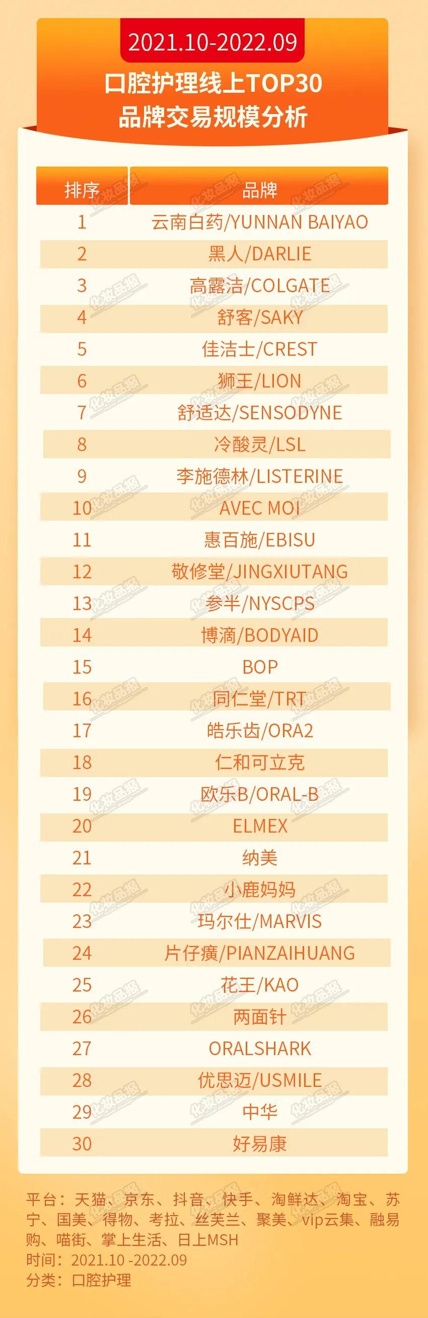 口腔護(hù)理:云南白藥領(lǐng)跑在口腔護(hù)理TOP30品牌中,云南白藥、黑人、高露潔、舒克、佳潔士位列前五。其中,云南白藥、黑人兩大品牌以優(yōu)勢領(lǐng)先,零售額均突破10億元。2019年成立的新銳品牌BOP以可觀的成績位列第15名。