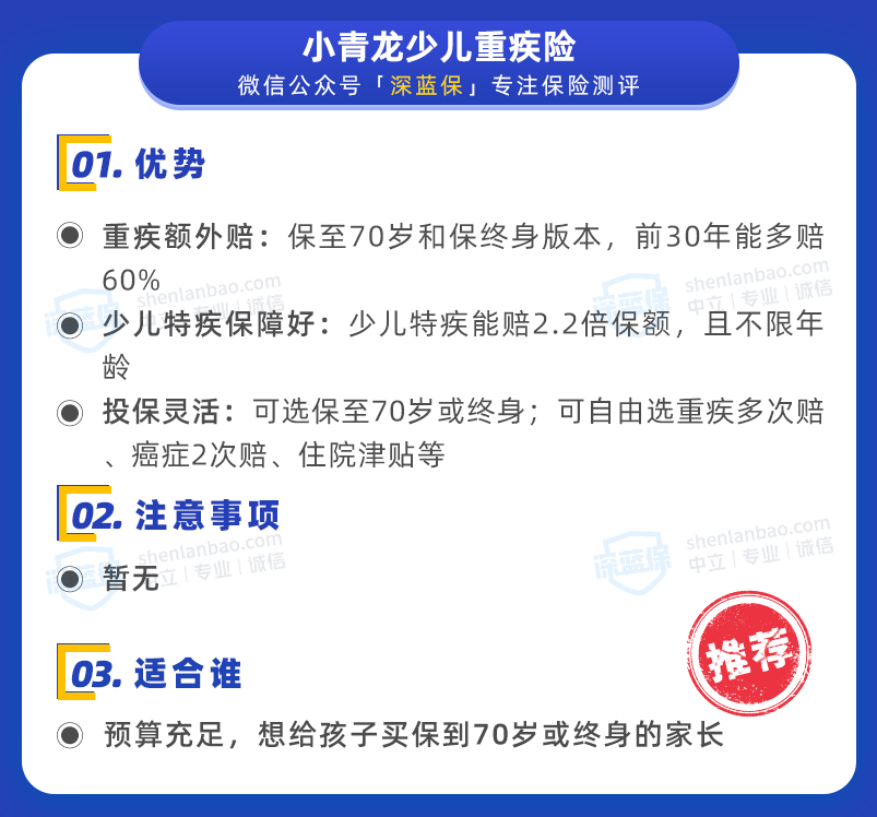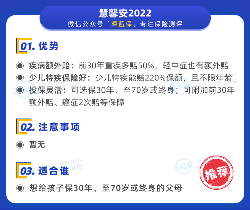 新增:青云衛(wèi)2號、小淘氣1號減少:大黃蜂7號(全能版)原因:「青云衛(wèi)2號」重新上線;「小淘氣1號」保終身時(shí)性價(jià)比很不錯(cuò),可附加前30年額外賠,價(jià)格比「大黃蜂7號(全能版)」便宜慧馨安2022我們前面講過,這款產(chǎn)品保至70歲或終身,性價(jià)比依然很高。如果要買這款產(chǎn)品,建議大家把“前30年額外賠”給加上,這樣重疾、輕中癥都有額外賠。