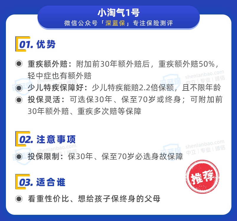 小淘氣1號能附加“前30年額外賠”,附加后重疾能額外賠60%,輕中癥也有額外賠,價(jià)格不貴,建議大家選上。