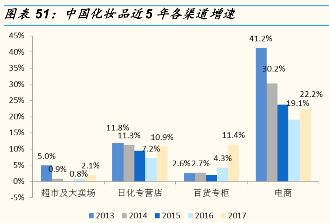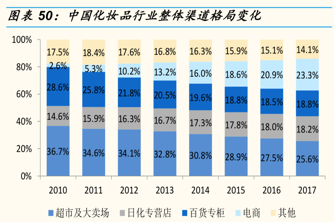 目前中國化妝品行業(yè)渠道中電商占比已經(jīng)超過 23%:中國 80、90、00 后成長于中國互聯(lián)網(wǎng)爆發(fā)之時,隨著這批新消費者成為美妝消費的主力人群,電商渠道高速成長為化妝品行業(yè)中的重要渠道。因此,在中國電商已經(jīng)成為化妝品銷售的兵家必爭之地。電商是中國商業(yè)核心的差異變量,是與海外化妝品市場差異巨大的點,也是中國本土品牌逆襲的利器。