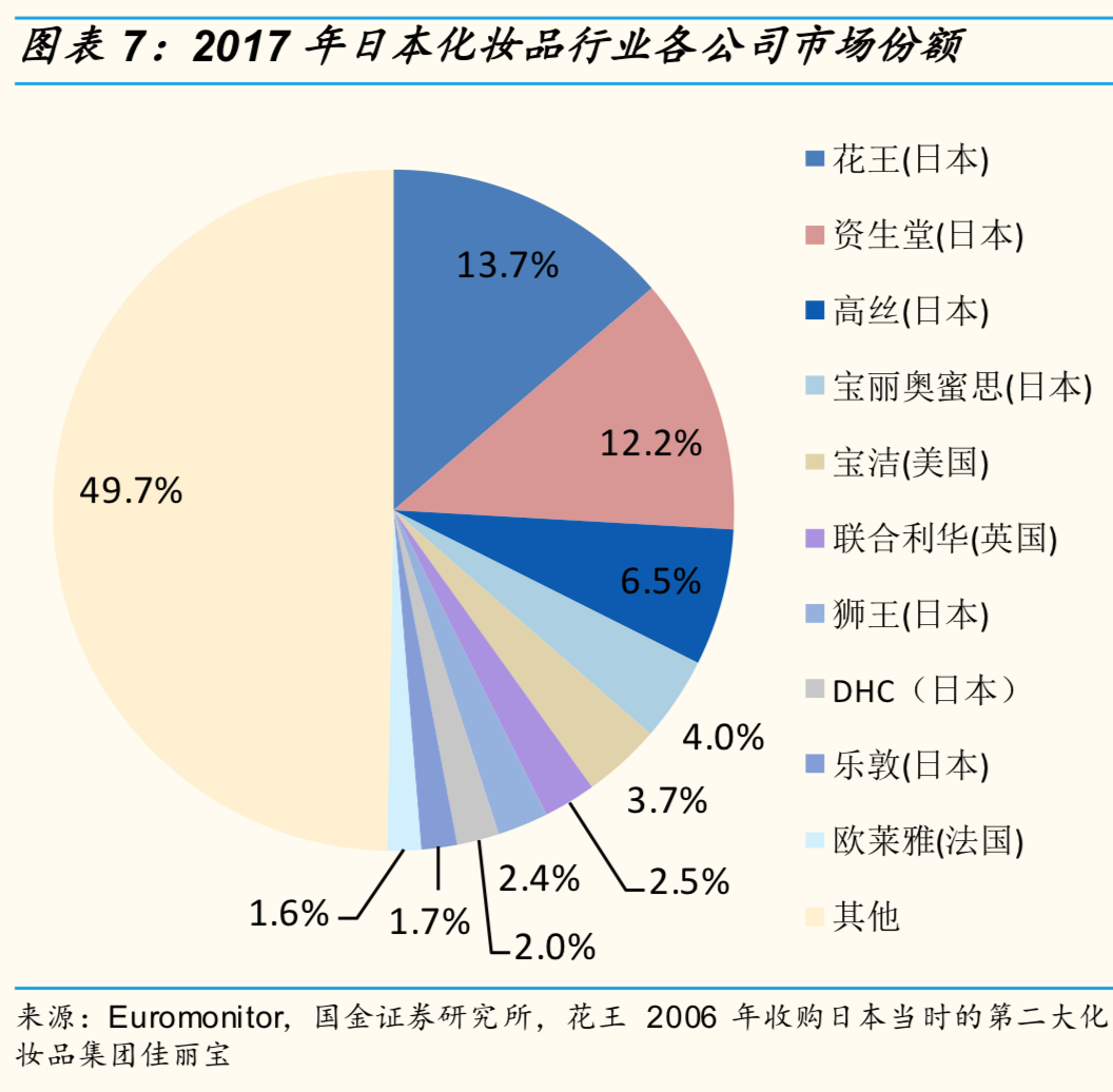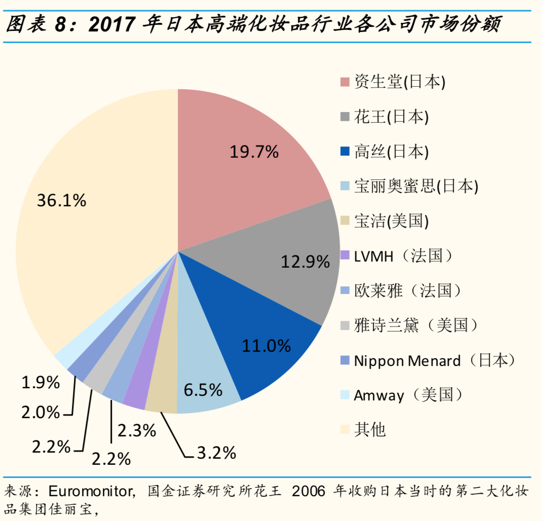 以資生堂為代表的日本化妝品集團力抗歐美巨頭,實現(xiàn)在本國市場的主 導(dǎo):日本戰(zhàn)后,化妝品行業(yè)曾經(jīng)也經(jīng)歷了崇洋媚外的階段,但是日本本土品牌憑借更符合本土文化的定位、獨具匠心的產(chǎn)品和強大的渠道和營銷能力,在本土市場實現(xiàn)了從崛起到主導(dǎo)的發(fā)展。2017 年日本化妝品行業(yè) CR10 中 7 家為本土企業(yè),外國企業(yè)僅有 3 家。2017 年日本高端化妝品行業(yè) CR10 合計占比為 63.9%,資生堂占比為 19.7 %:日本高端化妝品市場,頭部公司的市場份額同樣更為集中,CR4 均為日本本土企業(yè),合計占比為 50.1%。其中資生堂是日本高端市場市占率的公司,市場份額接近20%。