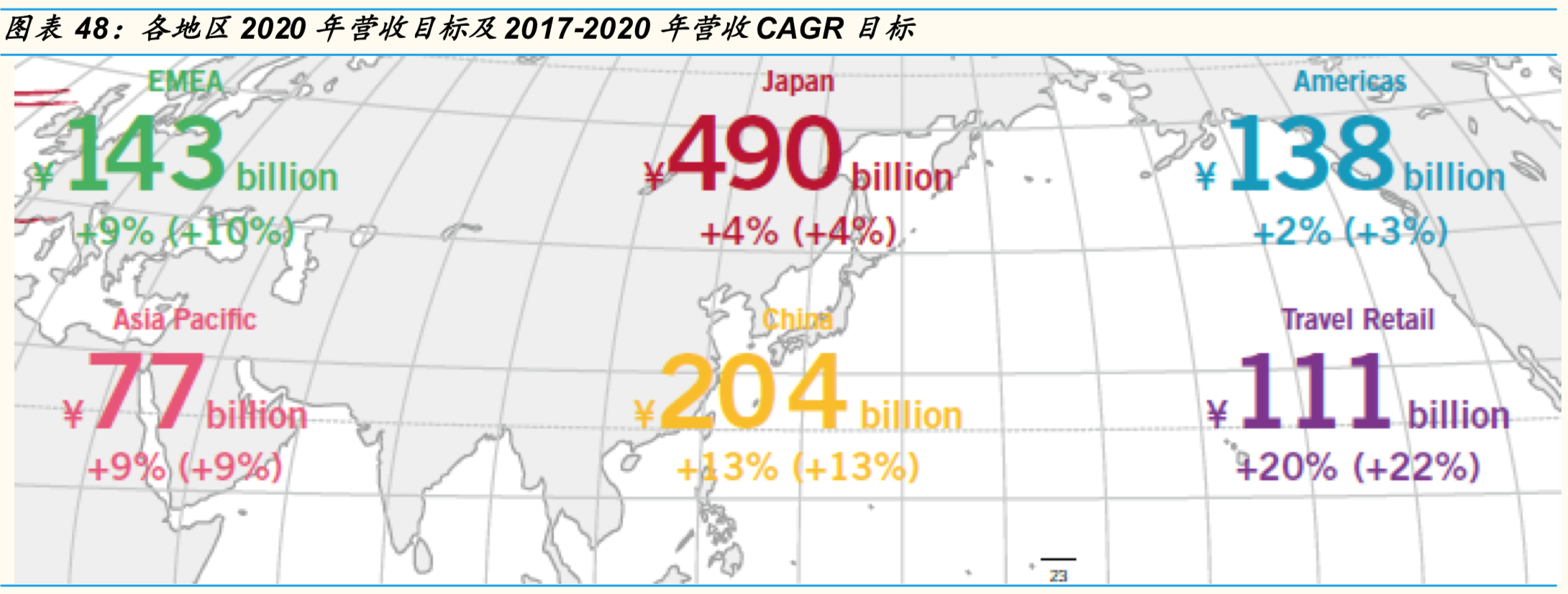 日本企業(yè)在國際化擴張中相對謹(jǐn)慎保守,資生堂雖然是日本化妝品企業(yè)中化程度高的,但日本本土銷售占比仍有 43%:2017 年資生堂和花王海外業(yè)務(wù)占比約為 57%,而日本另外三大化妝品集團花王、高絲和寶麗的海外業(yè)務(wù)占比僅為 37%、25%和 8%。我們認(rèn)為,化妝品是與地緣文化和商業(yè)文化息息相 關(guān)的消費品,資生堂 、花王、高絲、寶麗奧蜜思當(dāng)年能夠力抗歐美勁敵,實現(xiàn)對本國市場的主導(dǎo),是因為其更加符合日本本土文化。但在新一輪的國際化競爭中,如何適應(yīng)各地區(qū)的地緣和商業(yè)文化、滿足不同地區(qū)消費者的差異化需求是資生堂這樣的巨頭面臨的重要挑戰(zhàn)。為了更好地開展國際化業(yè)務(wù),資生堂開始采取經(jīng)營化的體制:資生堂在每個中心,都設(shè)立了一個母公司,每個中心公司都有自己的決策權(quán),以便于可以快速決策。當(dāng)?shù)氐腃EO 由當(dāng)?shù)叵碛惺⒚穆殬I(yè)經(jīng)理人來擔(dān)任,本地化策略使得整體公司銷售額可以實現(xiàn)增長。2020 年公司目標(biāo)在日本、中國、EMEA、美國、旅游零售和亞太地區(qū)分別實現(xiàn)營收 4900 億日元、2040 億日元、1430 億日元、1380 億日元、1110 億日元和 770 億日元。