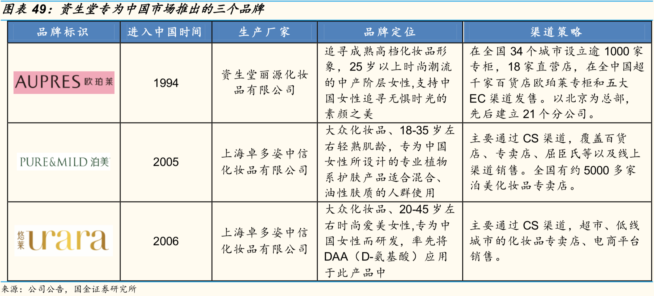 明星口碑產(chǎn)品筑就明星高端品牌:公司在悠久的歷史中培養(yǎng)了獨特的日本美感,產(chǎn)品設(shè)計和制造中彰顯著日本關(guān)注和重視細(xì)節(jié)的特點。例如SHISEIDO 以公司名稱命名,是代表集團形象的高端品牌,旗下五大口碑明星產(chǎn)品包括紅妍肌活精華露(2014 年 9 月發(fā)售,是資生堂的標(biāo)志性產(chǎn)品)、紅色蜜露精華化妝液(100 多年歷史,歷經(jīng) 8 次產(chǎn)品升級)、新透白美肌集光祛斑精華液、新艷陽夏臻效水動力防護乳和悅薇珀翡塑顏抗皺霜。而CLE DE BEAUTE 是公司定位于“”和“貴婦級”的品牌,旗下五大口碑明星產(chǎn)品包括金致乳霜、晶致肌活精華露、晶致眼霜、 光采采保濕露和光采日間防護乳/霜。