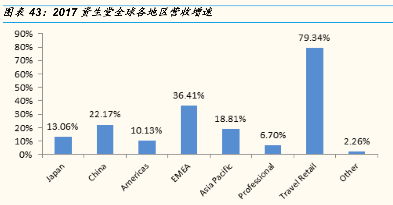 化是資生堂近年來的一大重要戰(zhàn)略:近年本土業(yè)務(wù)逐漸飽和,格局穩(wěn)定,資生 堂開始通過資本方式積極拓展海外業(yè)務(wù),進一步擴大市場規(guī)模和品牌知名度。從增速角度來看,旅游零售、EMEA 地區(qū)和中國為資生堂增速快的市場,2017 年營收增速分別為 79.34%、36.41%和 22.17%。