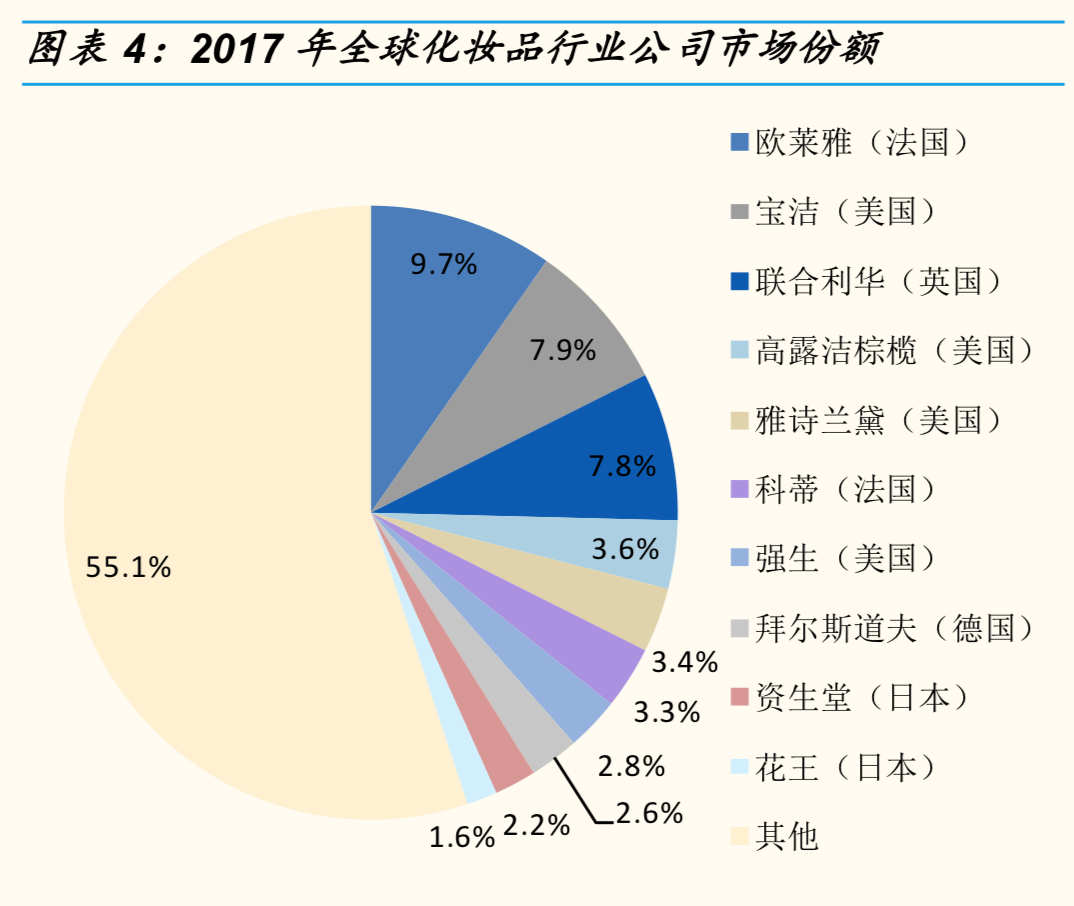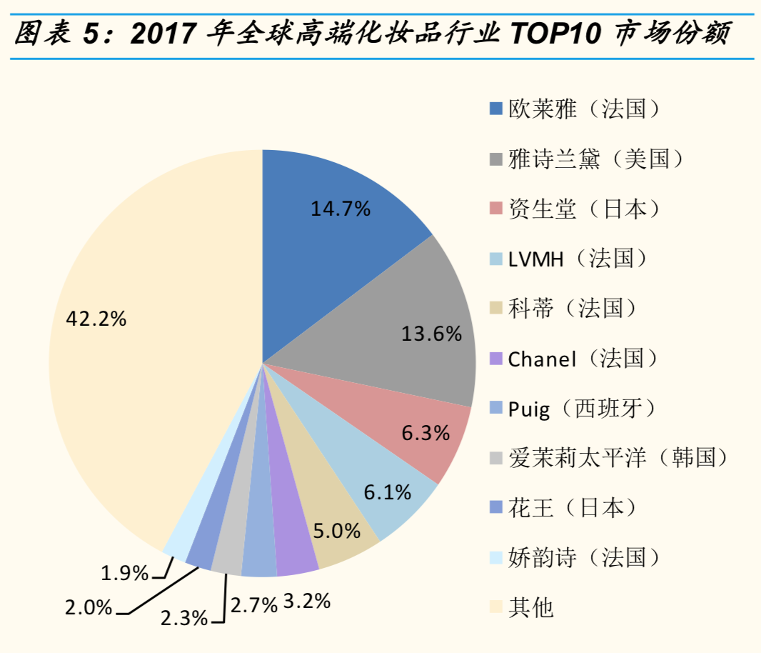 2017 年化妝品行業(yè) CR10 合計占比為44.9%:歐萊雅是市占率的公司,市場份額為9.7%。資生堂市占率排名第九,市場份額為 2.2%,是前十排名公司中的亞洲企業(yè)。2017 年高端化妝品行業(yè) CR10 合計占比為57.8%,高端市場頭部公司市場份額更為集中:歐萊雅和雅詩蘭黛是高端市場市占率和第二的公司,市場份額分別為14.7%和 13.6%。資生堂市占率排名第三,市場份額為6.3%,是高端市場前三公司排名中的亞洲企業(yè)。